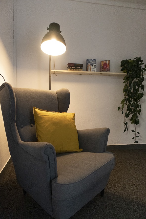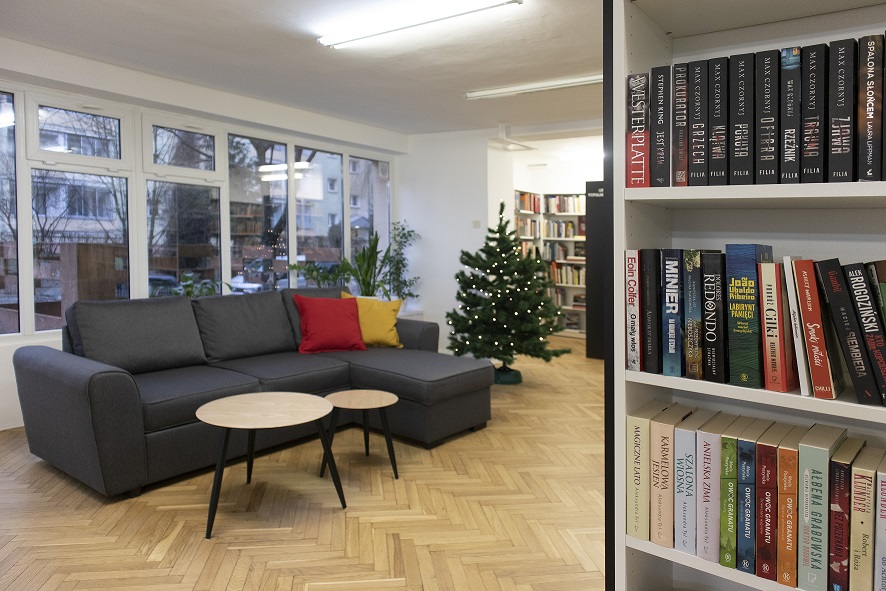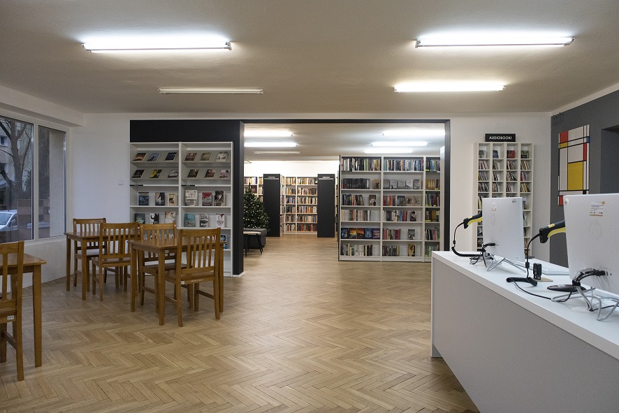 Do dyspozycji czytelników jest teraz więcej przestrzeni, przy wejściu pojawił się kącik do czytania z wygodnym fotelem i lampą, przestrzeń uzupełnia zieleń kwiatów. Po prawej stronie znajduje się sala dedykowana najmłodszym, jest w niej miejsce do czytania, ale także zabawy, a na półkach oprócz książek znajdziemy gry i zabawki. Dla nieco starszych dzieci powstało stoisko komputerowe.