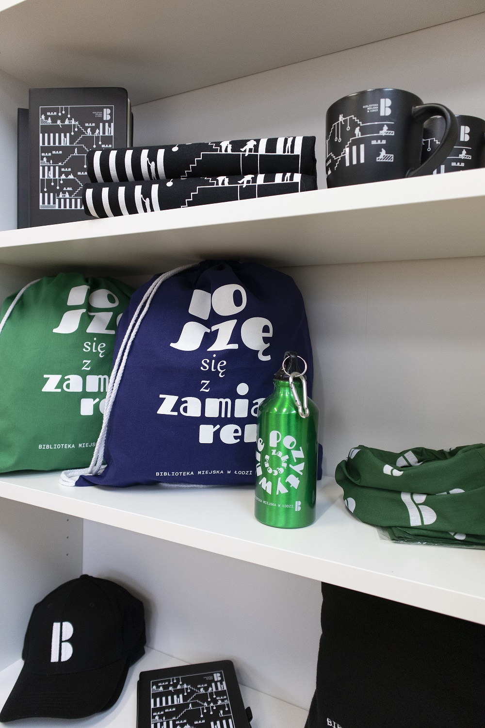 W pierwszej części czytelni stanęły stoły z krzesłami, nowe regały z książkami oraz półki z audiobookami. Za ladą znajdziemy gadżety Biblioteki Miejskiej w Łodzi - kominy, czapki, notesy czy kubki.