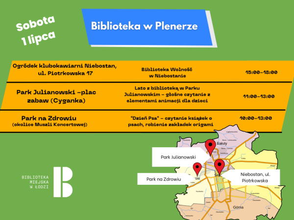 W wakacje Biblioteka Miejska wychodzi na zewnątrz. W okresie letnim mamy dla łodzian nowa formułę spędzania czasu z biblioteką, wychodzimy na zewnątrz, w plener. W każdy wakacyjny piątek i sobotę będzie można spotkać Bibliotekę w łódzkich parkach, terenach zielonych czyli wszędzie tam, gdzie łodzianie lubią spędzać wolny czas.