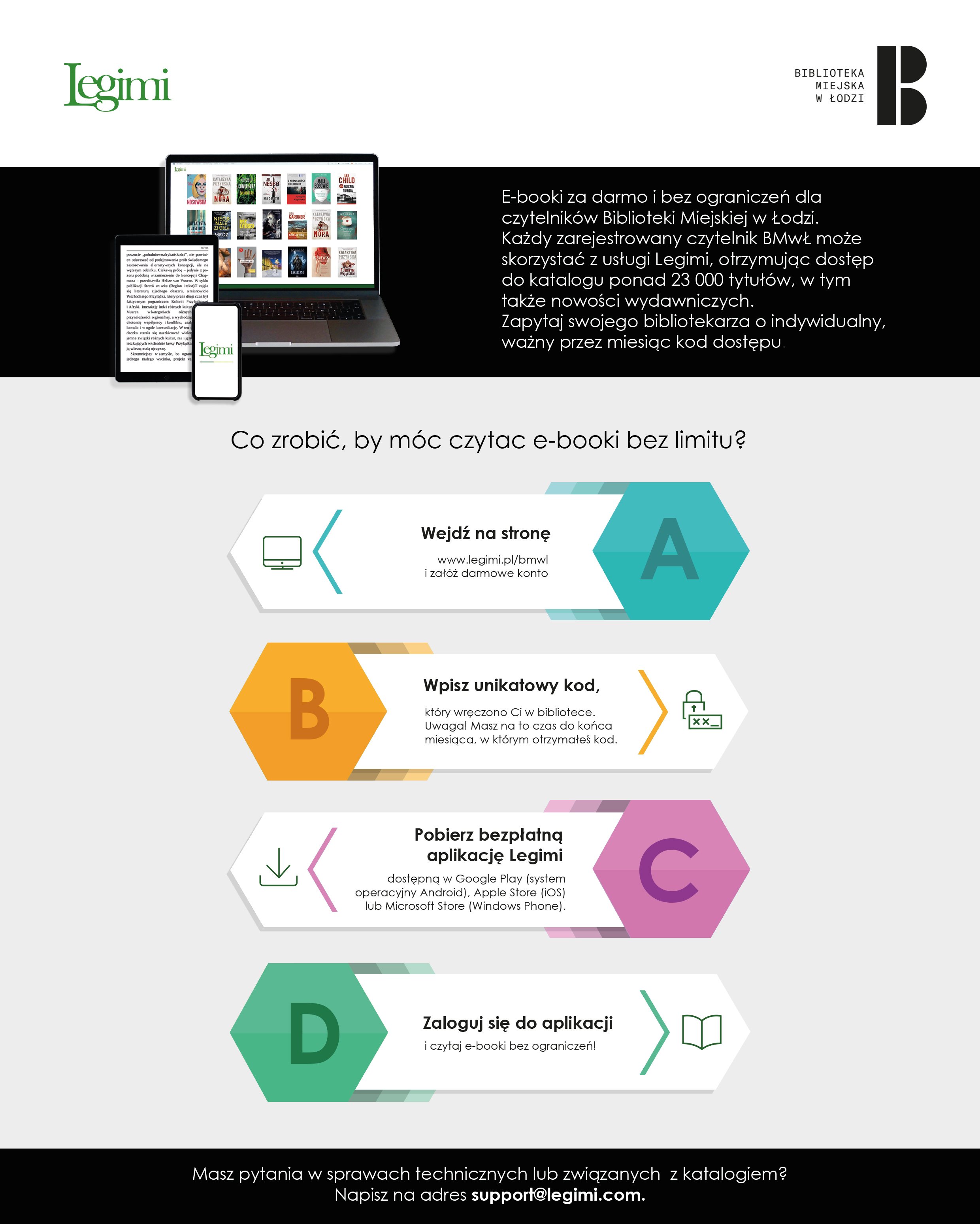 Wszystkich niezbędnych informacji, włącznie z instruktażem uruchamiania konta w serwisie Legimi, udzielą pracownicy filii BMwŁ. Ebooki można wypożyczać od 21 czerwca. Zapraszamy do bibliotek!