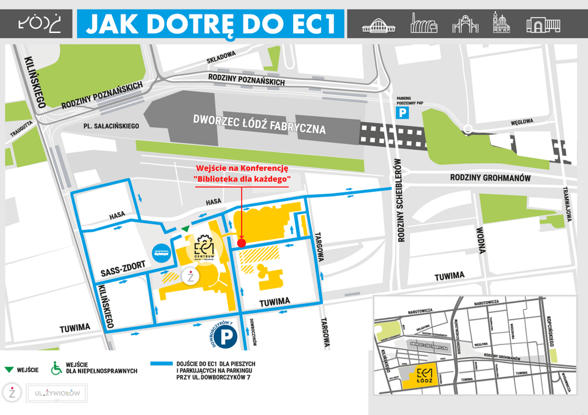 Miejsce konferencji: sale konferencyjne kompleksu EC1 (budynek z Planetarium, Halą Maszyn i NCKF), wejście bramą główną od ul. Targowej lub od ul. Tuwima (przedłużenie ul. Dowborczyków)