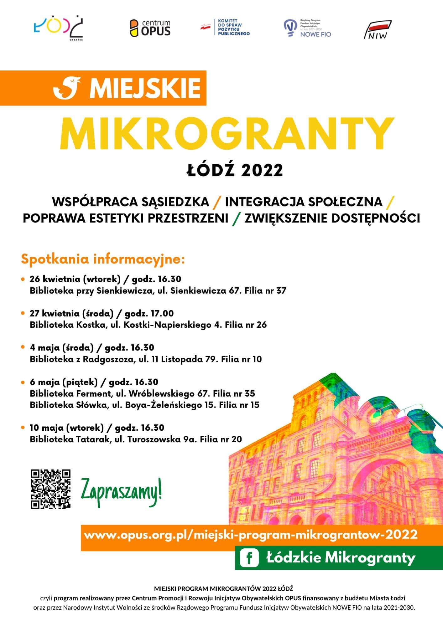 MIEJSKI PROGRAM MIKROGRANTÓW 2022 ŁÓDŹ to program realizowany przez Centrum Promocji i Rozwoju Inicjatyw Obywatelskich OPUS finansowany z budżetu Miasta Łodzi oraz przez Narodowy Instytut Wolności ze środków Rządowego Programu Fundusz Inicjatyw Obywatelskich NOWEFIO na lata 2021-2030.